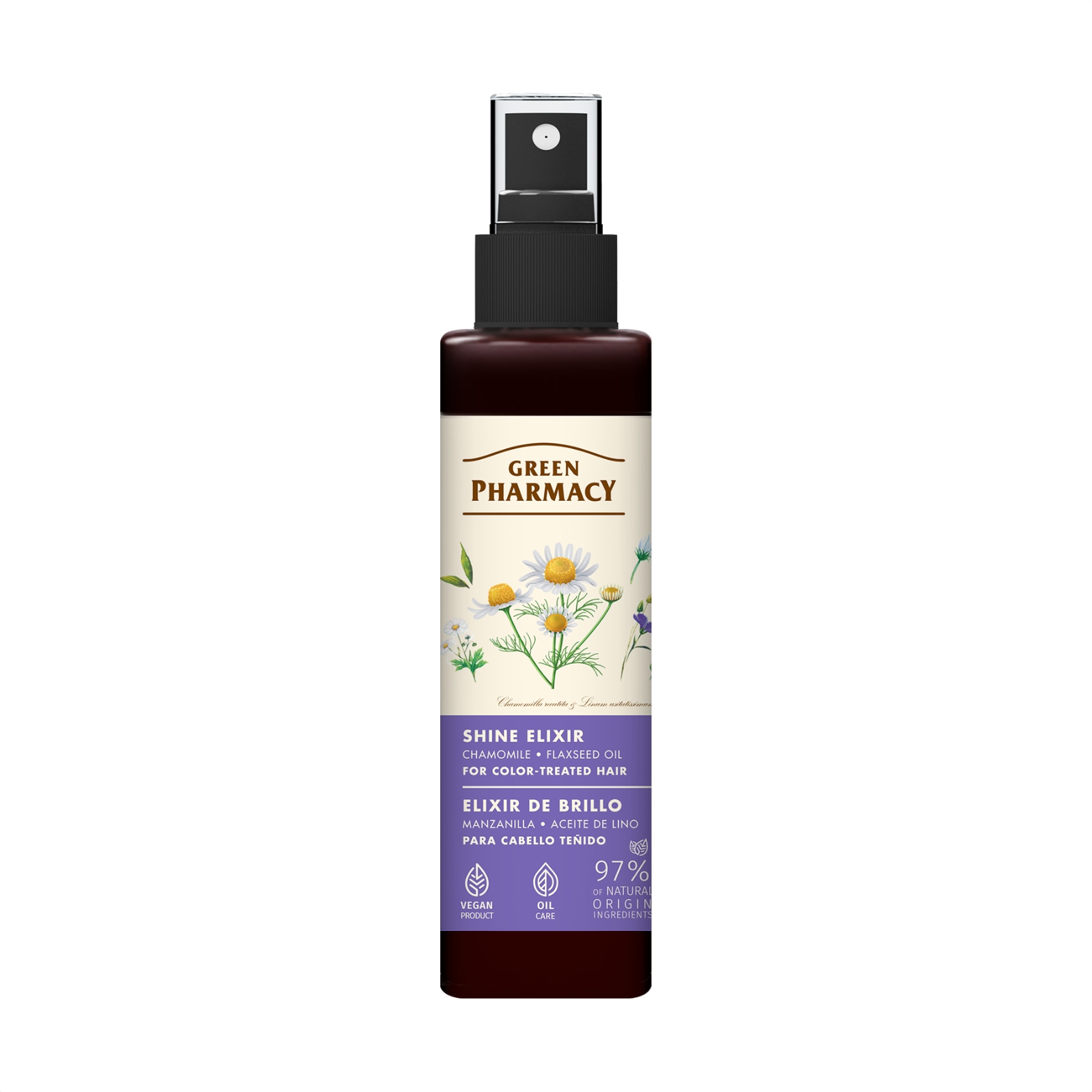 Το ελιξίριο λάμψης για βαμμένα μαλλιά Green Pharmacy με χαμομήλι και λινέλαιο έχει σχεδιαστεί για την καθημερινή φροντίδα μαλλιών που έχουν υποστεί φθορά από τη βαφή και εξωτερικούς επιβαρυντικούς παράγοντες. Η ελαφριά leave-in σύνθεσή του βοηθά στη λείανση της τρίχας, μειώνει την τραχύτητα και συμβάλλει στην πρόληψη της ψαλίδας.