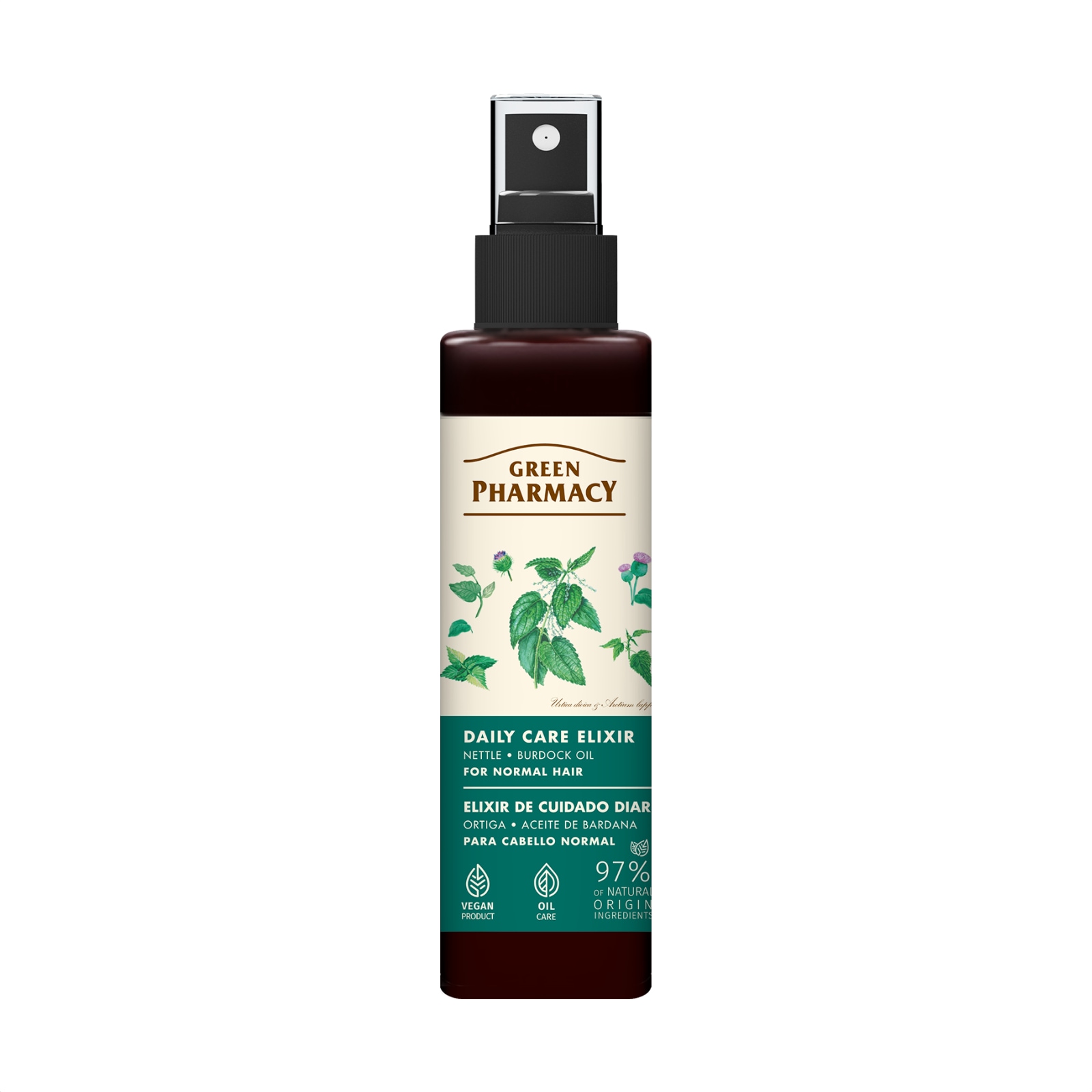 Το ελιξίριο καθημερινής περιποίησης Green Pharmacy με τσουκνίδα και έλαιο κολλιτσίδας έχει σχεδιαστεί για την ολοκληρωμένη φροντίδα κανονικών μαλλιών, προσφέροντας ισορροπημένη ενυδάτωση, θρέψη και προστασία σε καθημερινή βάση. Η ελαφριά leave-in σύνθεσή του εφαρμόζεται απευθείας στο τριχωτό της κεφαλής και στα μαλλιά, χωρίς να απαιτεί ξέβγαλμα και χωρίς να προκαλεί λιπαρότητα.